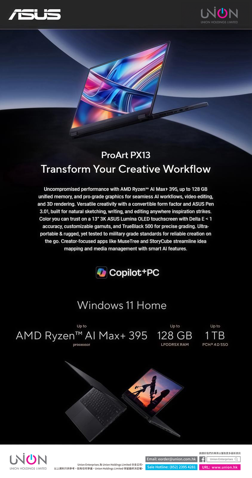 The ProArt PX13 is a next-generation AI-powered laptop for creators. Its 13-inch 360° convertible design allows for easy switching between different device modes, letting inspiration flow anytime, anywhere, and ignite your creative passion. The OLED touchscreen ensures precise color accuracy for flawless print quality, while its multi-functional I/O ports seamlessly connect to all your peripherals. Equipped with an NVIDIA® Studio-certified GeForce RTX™ 40 series discrete graphics card, it boasts powerful graphics capabilities and 321 TOPS of AI computing power. Furthermore, it features an AMD Ryzen™ AI 9 HX 370 processor with up to 50 TOPS of processing power. With AI-enhanced creative software, military-grade durability, and long-lasting battery life, the ProArt PX13 enables your professional creative work in any environment.